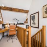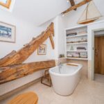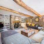 The kitchen is fitted with a comprehensive range of painted wooden cupboards with contrasting worksurfaces over, the design and décor of the kitchen is complemented with a slate tiled floor and a Rangemaster cooker. A door to the rear leads out to the courtyard garden, a perfect place to sit and enjoy your morning coffee. A brace and ledge oak door leads through to an inner hall with access to the downstairs W.C. and the utility/boot room. A door from the inner hall opens into the fabulous sitting room where the character continues with further exposed stone work, exposed beams and a wood burning stove set in a stone fire surround with wooden lintel over. The South facing French doors and full length windows to the side flood this room with light.