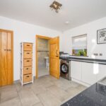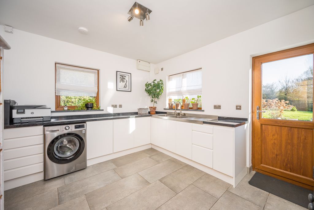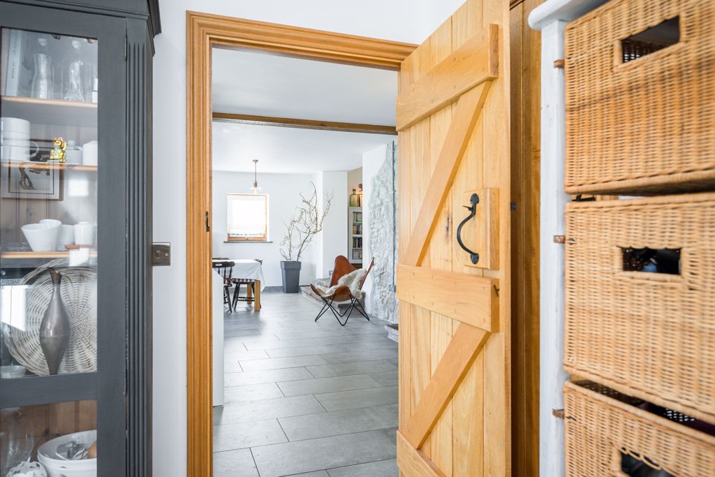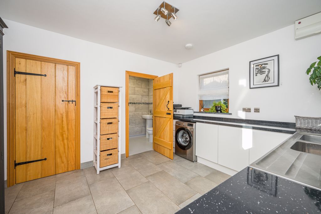 Truly the heart of the home, a perfect place to spend time with family, friends or just enjoy a peaceful coffee in the early morning. The kitchen is contemporary in design and fitted with the modern-day appliances that would be expected of a kitchen of this quality enhanced by solid worksurfaces, a substantial central island with hob and extractor over and a tiled floor. The dining area has ample space for a large table and chairs. The bi fold doors from the dining area, which flood the room with light, open to a terrace and the formal garden combining the indoors/outdoors during the summer months. Situated off the kitchen is a useful utility/laundry room with door to the outside. Whilst contemporary in design, the kitchen/living/dining room has retained the character of the original farmhouse with wooden brace and ledge doors, exposed stone, and timbers.