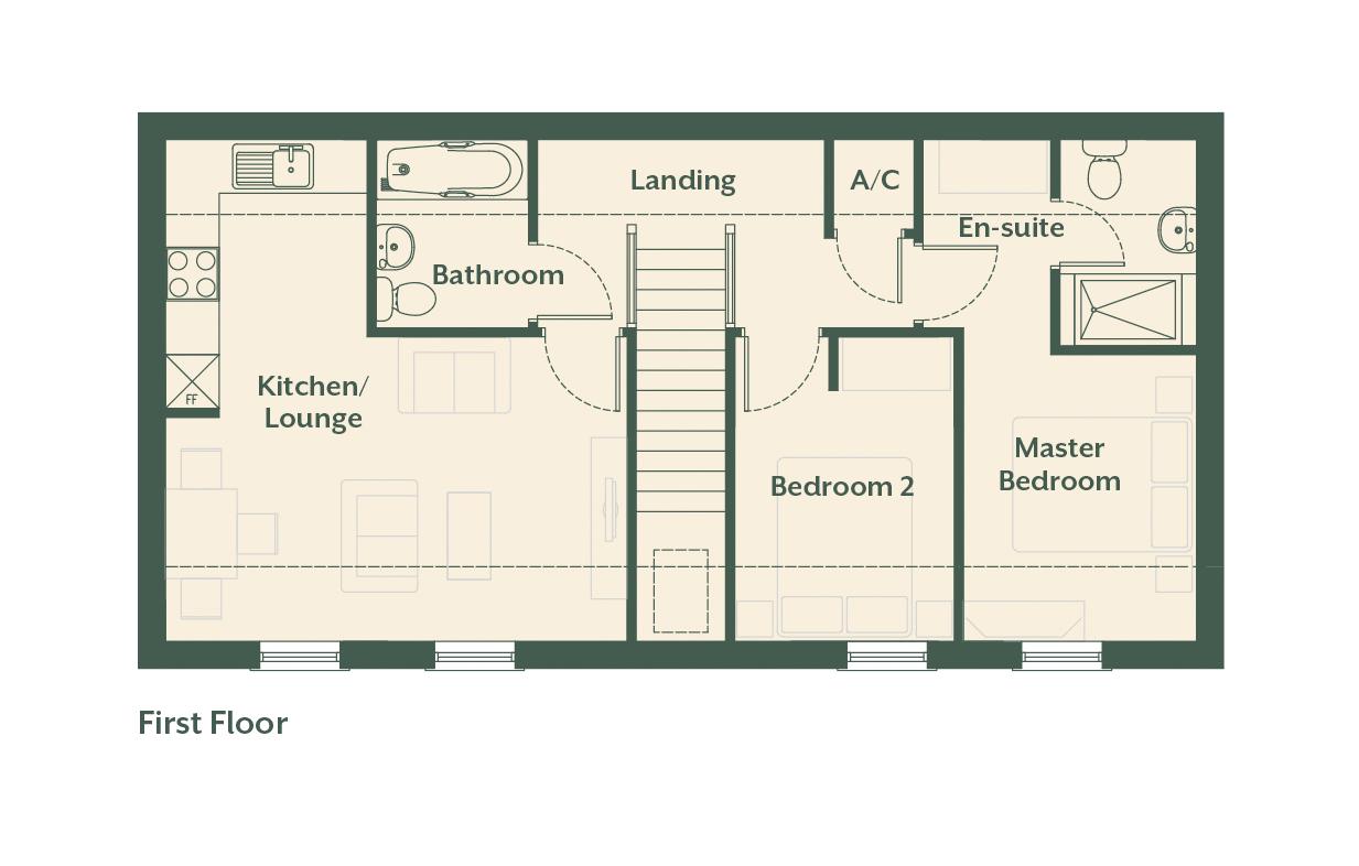 This new home is set on the first floor with access from a central staircase. Upstairs is an open plan kitchen/ living area, main bathroom featuring Porcelanosa tiling, a useful airing cupboard and two double bedrooms, one of these featuring an en-suite.